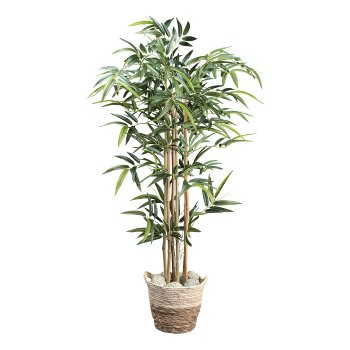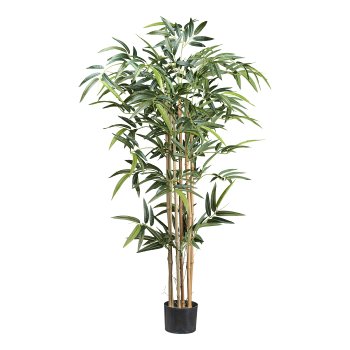 Der dekorative Bambus mit sechs echten Naturstämmen und insgesamt 480 fein ausgearbeiteten Blättern ist eine hochwertige Kunstpflanze, die jedem Raum eine harmonische, natürliche und moderne Atmosphäre verleiht. Mit einer Höhe von ca. 130 cm eignet sich dieser Bambus perfekt für Wohnbereiche, Büros, Salons, Eingangsbereiche, Hotels oder Wellnessräume. Die dicht arrangierten grünen Blätter wirken äußerst realistisch und verleihen dem Bambus eine lebendige, frische Optik. Die Pflanze wird im stabilen Kunststofftopf mit den Maßen 15 x 12 cm geliefert. Der Topf ist mit künstlicher Erde dekoriert und sorgt für ein authentisches Gesamtbild. Durch die Kombination aus echten Naturstämmen und hochwertigen Kunstblättern entsteht eine täuschend echte Erscheinung \endash ganz ohne Pflegeaufwand. Dauerhaft farbstabil, formschön und vielseitig kombinierbar. 1. Besteht der Bambus aus echtem Material? Die Stämme sind aus echtem Naturbambus; die Blätter bestehen aus hochwertigen Kunstfasern. 2. Wie hoch ist die Pflanze? Die Gesamthöhe beträgt ca. 130 cm. 3. Wie viele Blätter besitzt der Bambus? Insgesamt 480 realistisch gestaltete Blätter. 4. Wird der Topf mitgeliefert? Ja, der Bambus wird im Kunststofftopf 15 x 12 cm mit künstlicher Erde geliefert. 5. Muss der Bambus gepflegt werden? Nein, er ist vollständig pflegefrei. Leichtes Abstauben genügt. 6. Für welche Räume eignet sich der Bambus? Ideal für Wohnzimmer, Büros, Hotels, Salons, Eingangsbereiche und Wellnessbereiche. 7. Kann die Pflanze in einen Übertopf gestellt werden? Ja, der Innentopf kann in einen größeren dekorativen Übertopf gesetzt werden.