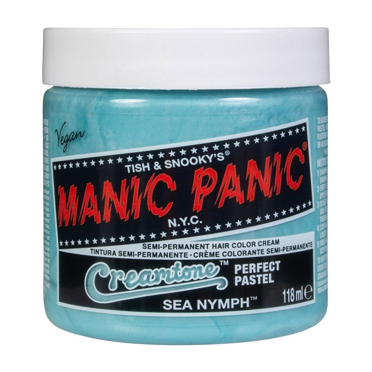mtone Perfect Pastel von Manic Panic ist die semi-permanente Haarfarben Serie für wunderschöne Pasteltöne. Erhältlich in herrlich hellen, frischen Farbtönen, die atemberaubende pastellfarbene Haarveränderungen versprechen.Aufgrund der geringeren Pigmentierung dieser Tönungen benötigst du eine sehr helle Grundlage, um lebendige und sichtbare Ergebnisse zu erzielen. Wenn du also planst, dein Haar mit einer der Farben aus der Creamtones-Serie zu tönen, musst du dein Haar vorher auf einen Blondton von 10 oder höher aufhellen. Die Manic Panic Blondierungskits wurden speziell dafür entwickelt und abgestimmt, um sie mit deinen Manic Panic Tönungen zu kombinieren. Erziele den maximalen Aufhellungseffekt mit dem 40 Volumen Blondierungskit.- Wunderschöne Pastelltöne- Blondton von Stufe 10+ wird benötigt- Vegan und tierversuchsfrei- Frei von PPD, Parabenen, Ammoniak, Resorcin, Phthalaten und Gluten- Etwa 2 - 4 Wochen lang anhaltende Farbe- Verblasst allmählich mit jeder Haarwäsche- Farbtöne sind untereinander mischbar- Gebrauchsfertig, kein Entwickler nötig- Hergestellt in den USA[Sea Nymph Haartönung]Sea Nymph ist eine pastellfarbene mintgrüne Haartönung mit gelben Untertönen. Pastel- & Grautöne enthalten weniger Pigmente als die lebhaften Farbtöne von Manic Panic und verblassen daher schneller.Wichtige MerkmaleErforderliches Haarlevel : 10 oder höherIntensität: Hell, pastellfarbendLanglebigkeit der Farbe : GeringUV-reaktiv : Nein[Wie viele 118 ml Dosen brauche ich für mein Haar?]- Kurzes bis boblanges Haar: 1 - 2 Dosen, je nach Haardicke- Schulter- bis taillenlanges Haar: 2 - 3 Dosen, je nach Haardicke. Bei dickem Haar kann eine zusätzliche Dose für die Spitzen erforderlich sein.- Taillenlanges und längeres Haar: 3+ Dosen, je nach Dicke des Haares[Anwendung]1. Das Haar mit einem tiefenreinigenden Shampoo waschen, keine Spülung verwenden.2. Trockne das Haar mit einem Föhn, um sicherzustellen, dass das Haar extrem porös ist.3. Ziehe Handschuhe an und trage die Tönung Strähne für Strähne mit einem Färbepinsel auf. Stelle sicher, dass jede Haarsträhne mit ausreichend Farbe bedeckt ist, um ein fleckiges Ergebnis zu vermeiden.4. Kämme anschließend das Haar durch, um sicherzustellen, dass die Farbe gleichmäßig verteilt wird. Die Farbcreme kann leicht schaumig werden.5. Decke das Haar mit einer Plastikhaube ab und lass die Farbe 30-45 Minuten einwirken. Für mehr Intensität unter einer Wärmequelle einwirken lassen.6. Spüle das Haar mit kaltem Wasser aus, bis das Wasser klar ist. Kontakt mit Gesicht und Körper vermeiden. Haare nicht shampoonieren.7. Wie gewünscht stylen. Um Farbübertragungen zu vermeiden, bitte immer sicherstellen, dass das Haar vollständig getrocket ist.[Profi-Tipps:]- Zur Sicherheit immer einen Strähnentest vorab durchführen.- Vor dem Färben ein pH-neutrales Shampoo verwenden, damit die Haarfarbe besser in das Haar einziehen kann.- Nach dem Auftragen der Farbe 5-10 Minuten lang gleichmäßig Wärme mit einem Haartrockner auf das Haar geben. Dadurch wird die Schuppenschicht geöffnet und die Manic Panic Haarfarbe kann besser ins Haar eindringen. Achte darauf, dass das Haar vor dem Ausspülen der Farbe vollständig abgekühlt ist.- Damit die Farbe länger frisch aussieht: mit kaltem Wasser Haare waschen, Manic Panic Hair Freshener/Trockenshampoo verwenden, Haare bei niedriger Hitze stylen. Bei Bedarf, füge bei deinem Conditioner etwas von der Haarfarbe hinzu!- Wir empfehlen, das Haar vor dem Färben zu blondieren.[Achtung]Nur zur äußeren Anwendung. Außerhalb der Reichweite von Kindern aufbewahren. Nur nach Anweisung verwenden. Dieses Produkt enthält Inhaltsstoffe, die bei bestimmten Personen zu Hautreizungen führen können; daher sollte zunächst ein Vorversuch gemäß den beiliegenden Anweisungen durchgeführt werden. Dieses Produkt nicht zum Färben von Augenbrauen oder Wimpern verwenden; dies kann zur Erblindung führen. Wenn das Produkt in die Augen gelangt, die Augen sofort mit Wasser ausspülen und einen Arzt aufsuchen.