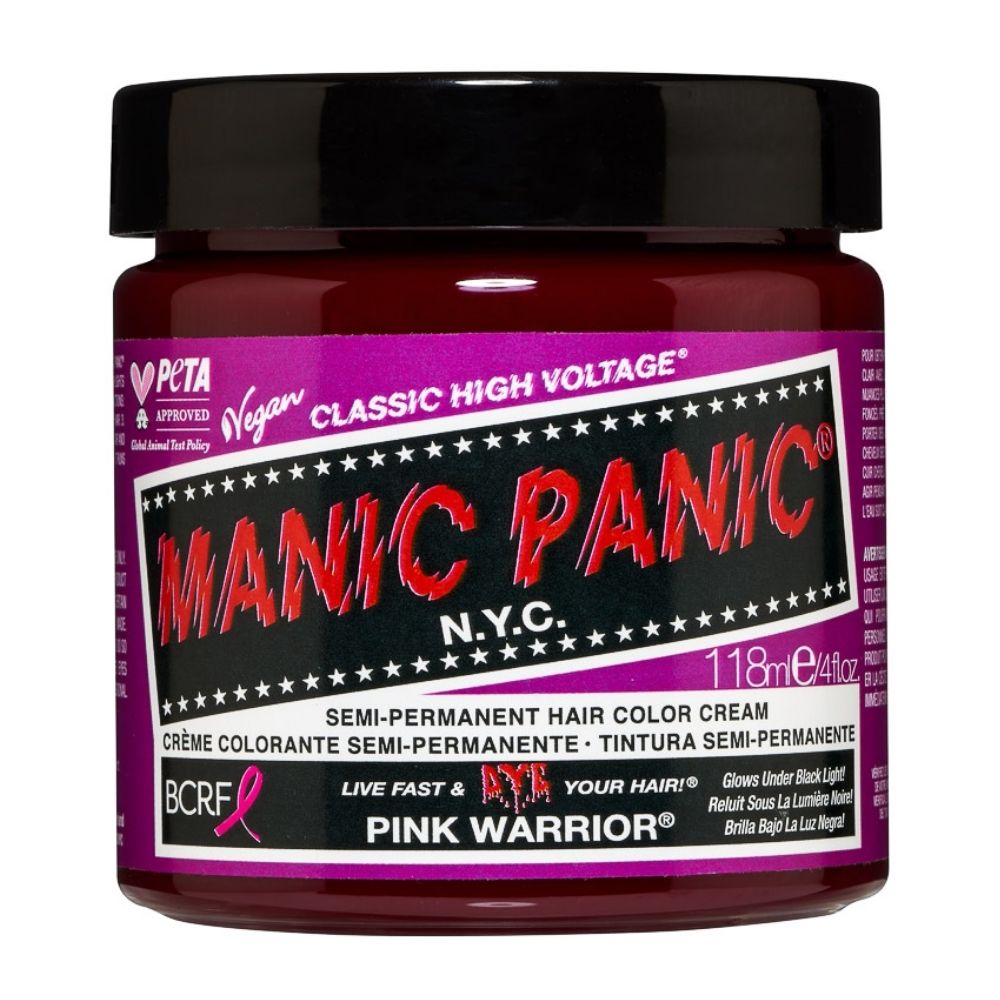 semi-permanente Haarfarbe High Voltage Classic von Manic Panic umfasst eine Vielzahl an leuchtenden Farbtönen. Die verwendeten hochwertigen Inhaltsstoffe stellen sicher, dass du ein hochwertiges Farbergebnis erhältst. Die pflegenden Inhaltsstoffe in der Formel konditionieren das Haar während des Färbens und sorgen so für ein seidig-glänzendes Finish sowie ein geschmeidiges Haargefühl.Manic Panic Haarfarben sind gebrauchsfertig und es ist kein Entwickler erforderlich. Die besten Ergebnisse erzielst du, wenn du dein Haar vorab mit dem Manic Panic Flash Lightning Bleach Kit auf ein helles Blond aufhellst.- Vegan und tierversuchsfrei- Frei von: PPD, Parabenen, Ammoniak, Resorcin, Phthalaten und Gluten- Etwa 4 - 6 Wochen lang anhaltende Farbe- Verblasst allmählich mit jeder Haarwäsche- Farbtöne sind untereinander mischbar- Kombinierbar mit dem Pastel-izer, um sanfte, trendige Pastelltöne zu kreieren- 8 UV-reaktive Farbtöne erhältlich, die unter Schwarzlicht leuchten- Gebrauchsfertig, kein Entwickler nötig- Beste Ergebnisse bei voraufgehelltem Haar- Hergestellt in den USA[Pink Warrior Haartönung]Pink Warrior ist ein kühles, moderates Neon-Pink, das unter Schwarzlicht leuchtet, wenn es auf blondem Haar der Stufe 10 oder heller gefärbt wird. Für tiefere Pink-Töne kann es auch auf ungefärbtem, unblondiertem Haar verwendet werden.Wichtige MerkmaleErforderliches Haarlevel : 10 oder höherIntensität: KräftigLanglebigkeit der Farbe : HochUV-reaktiv : Ja[Wie viele 118 ml Dosen brauche ich für mein Haar?]- Kurzes bis boblanges Haar: 1 - 2 Dosen, je nach Haardicke- Schulter- bis taillenlanges Haar: 2 - 3 Dosen, je nach Haardicke. Bei dickem Haar kann eine zusätzliche Dose für die Spitzen erforderlich sein.- Taillenlanges und längeres Haar: 3+ Dosen, je nach Dicke des Haares[Anwendung]1. Das Haar mit einem tiefenreinigenden Shampoo waschen, keine Spülung verwenden.2. Trockne das Haar mit einem Föhn, um sicherzustellen, dass das Haar extrem porös ist.3. Ziehe Handschuhe an und trage die Tönung Strähne für Strähne mit einem Färbepinsel auf. Stelle sicher, dass jede Haarsträhne mit ausreichend Farbe bedeckt ist, um ein fleckiges Ergebnis zu vermeiden.4. Kämme anschließend das Haar durch, um sicherzustellen, dass die Farbe gleichmäßig verteilt wird. Die Farbcreme kann leicht schaumig werden.5. Decke das Haar mit einer Plastikhaube ab und lass die Farbe 30-45 Minuten einwirken. Für mehr Intensität unter einer Wärmequelle einwirken lassen.6. Spüle das Haar mit kaltem Wasser aus, bis das Wasser klar ist. Kontakt mit Gesicht und Körper vermeiden. Haare nicht shampoonieren.7. Wie gewünscht stylen. Um Farbübertragungen zu vermeiden, bitte immer sicherstellen, dass das Haar vollständig getrocket ist.[Profi-Tipps:]- Zur Sicherheit immer einen Strähnentest vorab durchführen.- Vor dem Färben ein pH-neutrales Shampoo verwenden, damit die Haarfarbe besser in das Haar einziehen kann.- Nach dem Auftragen der Farbe 5-10 Minuten lang gleichmäßig Wärme mit einem Haartrockner auf das Haar geben. Dadurch wird die Schuppenschicht geöffnet und die Manic Panic Haarfarbe kann besser ins Haar eindringen. Achte darauf, dass das Haar vor dem Ausspülen der Farbe vollständig abgekühlt ist.- Damit die Farbe länger frisch aussieht: mit kaltem Wasser Haare waschen, Manic Panic Hair Freshener/Trockenshampoo verwenden, Haare bei niedriger Hitze stylen. Bei Bedarf, füge bei deinem Conditioner etwas von der Haarfarbe hinzu!- Wir empfehlen, das Haar vor dem Färben zu blondieren.[Achtung]Nur zur äußeren Anwendung. Außerhalb der Reichweite von Kindern aufbewahren. Nur nach Anweisung verwenden. Dieses Produkt enthält Inhaltsstoffe, die bei bestimmten Personen zu Hautreizungen führen können; daher sollte zunächst ein Vorversuch gemäß den beiliegenden Anweisungen durchgeführt werden. Dieses Produkt nicht zum Färben von Augenbrauen oder Wimpern verwenden; dies kann zur Erblindung führen. Wenn das Produkt in die Augen gelangt, die Augen sofort mit Wasser ausspülen und einen Arzt aufsuchen.