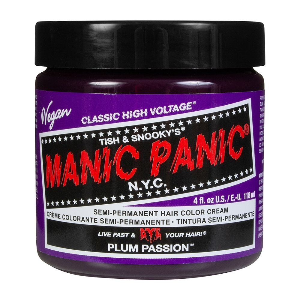 semi-permanente Haarfarbe High Voltage Classic von Manic Panic umfasst eine Vielzahl an leuchtenden Farbtönen. Die verwendeten hochwertigen Inhaltsstoffe stellen sicher, dass du ein hochwertiges Farbergebnis erhältst. Die pflegenden Inhaltsstoffe in der Formel konditionieren das Haar während des Färbens und sorgen so für ein seidig-glänzendes Finish sowie ein geschmeidiges Haargefühl.Manic Panic Haarfarben sind gebrauchsfertig und es ist kein Entwickler erforderlich. Die besten Ergebnisse erzielst du, wenn du dein Haar vorab mit dem Manic Panic Flash Lightning Bleach Kit auf ein helles Blond aufhellst.- Vegan und tierversuchsfrei- Frei von: PPD, Parabenen, Ammoniak, Resorcin, Phthalaten und Gluten- Etwa 4 - 6 Wochen lang anhaltende Farbe- Verblasst allmählich mit jeder Haarwäsche- Farbtöne sind untereinander mischbar- Kombinierbar mit dem Pastel-izer, um sanfte, trendige Pastelltöne zu kreieren- 8 UV-reaktive Farbtöne erhältlich, die unter Schwarzlicht leuchten- Gebrauchsfertig, kein Entwickler nötig- Beste Ergebnisse bei voraufgehelltem Haar- Hergestellt in den USA[Plum Passion Haartönung]Plum Passion ist eine violette Haartönung mit warmen Farbnuancen und roten Untertönen, die das Haar wie ihren Namensgeber aussehen lässt. Plum Passion verleiht auch ungefärbtem, unblondiertem Haar einen violetten Farbton. Für ein optimales Ergebnis empfehlen wir jedoch, das Haar vor der Anwendung auf die Blondstufe 7 oder heller aufzuhellen.Wichtige MerkmaleErforderliches Haarlevel : 7 oder höherIntensität: KräftigLanglebigkeit der Farbe : HochUV-reaktiv : Nein[Wie viele 118 ml Dosen brauche ich für mein Haar?]- Kurzes bis boblanges Haar: 1 - 2 Dosen, je nach Haardicke- Schulter- bis taillenlanges Haar: 2 - 3 Dosen, je nach Haardicke. Bei dickem Haar kann eine zusätzliche Dose für die Spitzen erforderlich sein.- Taillenlanges und längeres Haar: 3+ Dosen, je nach Dicke des Haares[Anwendung]1. Das Haar mit einem tiefenreinigenden Shampoo waschen, keine Spülung verwenden.2. Trockne das Haar mit einem Föhn, um sicherzustellen, dass das Haar extrem porös ist.3. Ziehe Handschuhe an und trage die Tönung Strähne für Strähne mit einem Färbepinsel auf. Stelle sicher, dass jede Haarsträhne mit ausreichend Farbe bedeckt ist, um ein fleckiges Ergebnis zu vermeiden.4. Kämme anschließend das Haar durch, um sicherzustellen, dass die Farbe gleichmäßig verteilt wird. Die Farbcreme kann leicht schaumig werden.5. Decke das Haar mit einer Plastikhaube ab und lass die Farbe 30-45 Minuten einwirken. Für mehr Intensität unter einer Wärmequelle einwirken lassen.6. Spüle das Haar mit kaltem Wasser aus, bis das Wasser klar ist. Kontakt mit Gesicht und Körper vermeiden. Haare nicht shampoonieren.7. Wie gewünscht stylen. Um Farbübertragungen zu vermeiden, bitte immer sicherstellen, dass das Haar vollständig getrocket ist.[Profi-Tipps:]- Zur Sicherheit immer einen Strähnentest vorab durchführen.- Vor dem Färben ein pH-neutrales Shampoo verwenden, damit die Haarfarbe besser in das Haar einziehen kann.- Nach dem Auftragen der Farbe 5-10 Minuten lang gleichmäßig Wärme mit einem Haartrockner auf das Haar geben. Dadurch wird die Schuppenschicht geöffnet und die Manic Panic Haarfarbe kann besser ins Haar eindringen. Achte darauf, dass das Haar vor dem Ausspülen der Farbe vollständig abgekühlt ist.- Damit die Farbe länger frisch aussieht: mit kaltem Wasser Haare waschen, Manic Panic Hair Freshener/Trockenshampoo verwenden, Haare bei niedriger Hitze stylen. Bei Bedarf, füge bei deinem Conditioner etwas von der Haarfarbe hinzu!- Wir empfehlen, das Haar vor dem Färben zu blondieren.[Achtung]Nur zur äußeren Anwendung. Außerhalb der Reichweite von Kindern aufbewahren. Nur nach Anweisung verwenden. Dieses Produkt enthält Inhaltsstoffe, die bei bestimmten Personen zu Hautreizungen führen können; daher sollte zunächst ein Vorversuch gemäß den beiliegenden Anweisungen durchgeführt werden. Dieses Produkt nicht zum Färben von Augenbrauen oder Wimpern verwenden; dies kann zur Erblindung führen. Wenn das Produkt in die Augen gelangt, die Augen sofort mit Wasser ausspülen und einen Arzt aufsuchen.