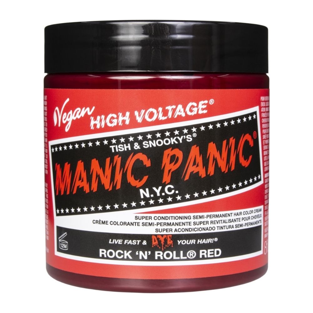 semi-permanente Haarfarbe High Voltage Classic von Manic Panic umfasst eine Vielzahl an leuchtenden Farbtönen. Die verwendeten hochwertigen Inhaltsstoffe stellen sicher, dass du ein hochwertiges Farbergebnis erhältst. Die pflegenden Inhaltsstoffe in der Formel konditionieren das Haar während des Färbens und sorgen so für ein seidig-glänzendes Finish sowie ein geschmeidiges Haargefühl.Manic Panic Haarfarben sind gebrauchsfertig und es ist kein Entwickler erforderlich. Die besten Ergebnisse erzielst du, wenn du dein Haar vorab mit dem Manic Panic Flash Lightning Bleach Kit auf ein helles Blond aufhellst.- Vegan und tierversuchsfrei- Frei von: PPD, Parabenen, Ammoniak, Resorcin, Phthalaten und Gluten- Etwa 4 - 6 Wochen lang anhaltende Farbe- Verblasst allmählich mit jeder Haarwäsche- Farbtöne sind untereinander mischbar- Kombinierbar mit dem Pastel-izer, um sanfte, trendige Pastelltöne zu kreieren- 8 UV-reaktive Farbtöne erhältlich, die unter Schwarzlicht leuchten- Gebrauchsfertig, kein Entwickler nötig- Beste Ergebnisse bei voraufgehelltem Haar- Hergestellt in den USA[Rock ’n’ Roll Red Haartönung]Rock ’n’ Roll Red ist eine warme, leuchtend rote Haartönung. Dieses Rot mit mittlerem Farbton wird für die Anwendung auf Haar empfohlen, das zuvor auf ein Blond der Stufe 8 oder heller aufgehellt wurde.Wichtige MerkmaleErforderliches Haarlevel : 8 oder höherIntensität: ModeratLanglebigkeit der Farbe : ModeratUV-reaktiv : Nein[Wie viele 237 ml Dosen brauche ich für mein Haar?]- Kurzes bis boblanges Haar: 1 Dose, je nach Haardicke- Schulter- bis taillenlanges Haar: 1 - 2 Dosen, je nach Haardicke. Bei dickem Haar kann eine zusätzliche Dose für die Spitzen erforderlich sein.- Taillenlanges und längeres Haar: 2+ Dosen, je nach Dicke des Haares[Anwendung]1. Das Haar mit einem tiefenreinigenden Shampoo waschen, keine Spülung verwenden.2. Trockne das Haar mit einem Föhn, um sicherzustellen, dass das Haar extrem porös ist.3. Ziehe Handschuhe an und trage die Tönung Strähne für Strähne mit einem Färbepinsel auf. Stelle sicher, dass jede Haarsträhne mit ausreichend Farbe bedeckt ist, um ein fleckiges Ergebnis zu vermeiden.4. Kämme anschließend das Haar durch, um sicherzustellen, dass die Farbe gleichmäßig verteilt wird. Die Farbcreme kann leicht schaumig werden.5. Decke das Haar mit einer Plastikhaube ab und lass die Farbe 30-45 Minuten einwirken. Für mehr Intensität unter einer Wärmequelle einwirken lassen.6. Spüle das Haar mit kaltem Wasser aus, bis das Wasser klar ist. Kontakt mit Gesicht und Körper vermeiden. Haare nicht shampoonieren.7. Wie gewünscht stylen. Um Farbübertragungen zu vermeiden, bitte immer sicherstellen, dass das Haar vollständig getrocket ist.[Profi-Tipps:]- Zur Sicherheit immer einen Strähnentest vorab durchführen.- Vor dem Färben ein pH-neutrales Shampoo verwenden, damit die Haarfarbe besser in das Haar einziehen kann.- Nach dem Auftragen der Farbe 5-10 Minuten lang gleichmäßig Wärme mit einem Haartrockner auf das Haar geben. Dadurch wird die Schuppenschicht geöffnet und die Manic Panic Haarfarbe kann besser ins Haar eindringen. Achte darauf, dass das Haar vor dem Ausspülen der Farbe vollständig abgekühlt ist.- Damit die Farbe länger frisch aussieht: mit kaltem Wasser Haare waschen, Manic Panic Hair Freshener/Trockenshampoo verwenden, Haare bei niedriger Hitze stylen. Bei Bedarf, füge bei deinem Conditioner etwas von der Haarfarbe hinzu!- Wir empfehlen, das Haar vor dem Färben zu blondieren.[Achtung]Nur zur äußeren Anwendung. Außerhalb der Reichweite von Kindern aufbewahren. Nur nach Anweisung verwenden. Dieses Produkt enthält Inhaltsstoffe, die bei bestimmten Personen zu Hautreizungen führen können; daher sollte zunächst ein Vorversuch gemäß den beiliegenden Anweisungen durchgeführt werden. Dieses Produkt nicht zum Färben von Augenbrauen oder Wimpern verwenden; dies kann zur Erblindung führen. Wenn das Produkt in die Augen gelangt, die Augen sofort mit Wasser ausspülen und einen Arzt aufsuchen.