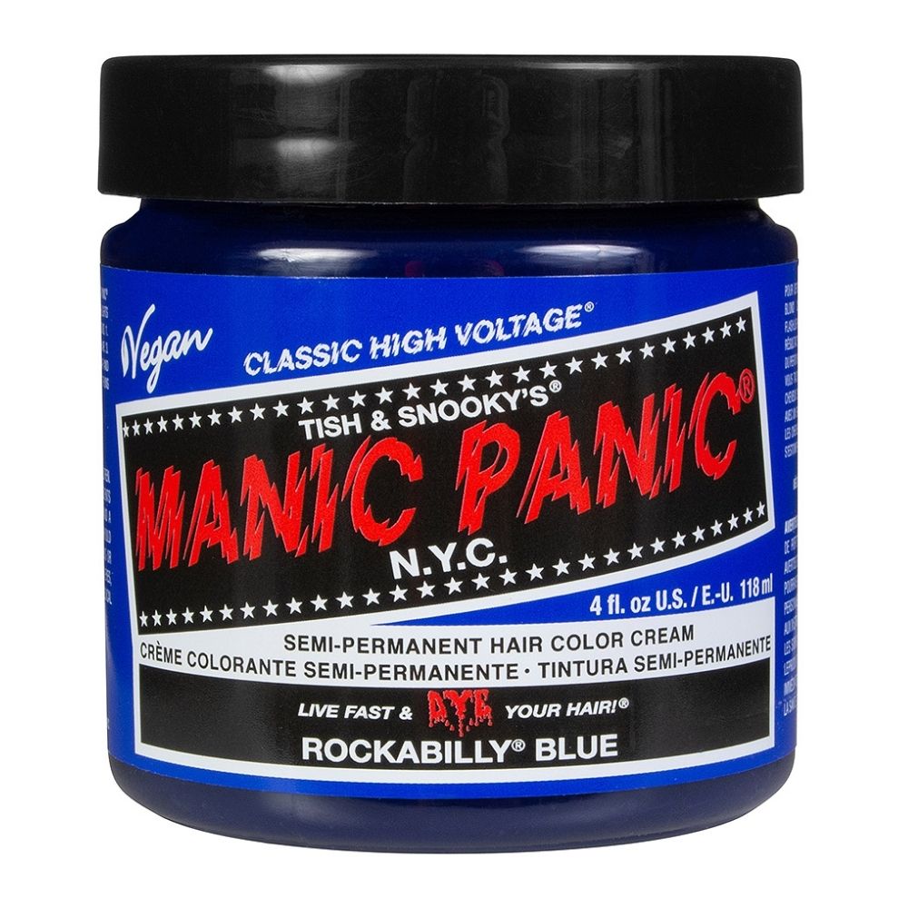 semi-permanente Haarfarbe High Voltage Classic von Manic Panic umfasst eine Vielzahl an leuchtenden Farbtönen. Die verwendeten hochwertigen Inhaltsstoffe stellen sicher, dass du ein hochwertiges Farbergebnis erhältst. Die pflegenden Inhaltsstoffe in der Formel konditionieren das Haar während des Färbens und sorgen so für ein seidig-glänzendes Finish sowie ein geschmeidiges Haargefühl.Manic Panic Haarfarben sind gebrauchsfertig und es ist kein Entwickler erforderlich. Die besten Ergebnisse erzielst du, wenn du dein Haar vorab mit dem Manic Panic Flash Lightning Bleach Kit auf ein helles Blond aufhellst.- Vegan und tierversuchsfrei- Frei von: PPD, Parabenen, Ammoniak, Resorcin, Phthalaten und Gluten- Etwa 4 - 6 Wochen lang anhaltende Farbe- Verblasst allmählich mit jeder Haarwäsche- Farbtöne sind untereinander mischbar- Kombinierbar mit dem Pastel-izer, um sanfte, trendige Pastelltöne zu kreieren- 8 UV-reaktive Farbtöne erhältlich, die unter Schwarzlicht leuchten- Gebrauchsfertig, kein Entwickler nötig- Beste Ergebnisse bei voraufgehelltem Haar- Hergestellt in den USA[Rockabilly Blue Haartönung]Rockabilly Blue ist eine unserer stärksten, neutralen blauen Haarfarben. Dieses leuchtende, ultrastarke Blau hinterlässt kühle Töne auf ungefärbtem, unblondiertem Haar. Für optimale Ergebnisse empfehlen wir, das Haar auf Blondstufe 9 oder heller aufzuhellen und vor der Anwendung zu tönen, um unerwünschte Farbtöne zu vermeiden.Wichtige MerkmaleErforderliches Haarlevel : 9 oder höherIntensität: ModeratLanglebigkeit der Farbe : ModeratUV-reaktiv : Nein[Wie viele 118 ml Dosen brauche ich für mein Haar?]- Kurzes bis boblanges Haar: 1 - 2 Dosen, je nach Haardicke- Schulter- bis taillenlanges Haar: 2 - 3 Dosen, je nach Haardicke. Bei dickem Haar kann eine zusätzliche Dose für die Spitzen erforderlich sein.- Taillenlanges und längeres Haar: 3+ Dosen, je nach Dicke des Haares[Anwendung]1. Das Haar mit einem tiefenreinigenden Shampoo waschen, keine Spülung verwenden.2. Trockne das Haar mit einem Föhn, um sicherzustellen, dass das Haar extrem porös ist.3. Ziehe Handschuhe an und trage die Tönung Strähne für Strähne mit einem Färbepinsel auf. Stelle sicher, dass jede Haarsträhne mit ausreichend Farbe bedeckt ist, um ein fleckiges Ergebnis zu vermeiden.4. Kämme anschließend das Haar durch, um sicherzustellen, dass die Farbe gleichmäßig verteilt wird. Die Farbcreme kann leicht schaumig werden.5. Decke das Haar mit einer Plastikhaube ab und lass die Farbe 30-45 Minuten einwirken. Für mehr Intensität unter einer Wärmequelle einwirken lassen.6. Spüle das Haar mit kaltem Wasser aus, bis das Wasser klar ist. Kontakt mit Gesicht und Körper vermeiden. Haare nicht shampoonieren.7. Wie gewünscht stylen. Um Farbübertragungen zu vermeiden, bitte immer sicherstellen, dass das Haar vollständig getrocket ist.[Profi-Tipps:]- Zur Sicherheit immer einen Strähnentest vorab durchführen.- Vor dem Färben ein pH-neutrales Shampoo verwenden, damit die Haarfarbe besser in das Haar einziehen kann.- Nach dem Auftragen der Farbe 5-10 Minuten lang gleichmäßig Wärme mit einem Haartrockner auf das Haar geben. Dadurch wird die Schuppenschicht geöffnet und die Manic Panic Haarfarbe kann besser ins Haar eindringen. Achte darauf, dass das Haar vor dem Ausspülen der Farbe vollständig abgekühlt ist.- Damit die Farbe länger frisch aussieht: mit kaltem Wasser Haare waschen, Manic Panic Hair Freshener/Trockenshampoo verwenden, Haare bei niedriger Hitze stylen. Bei Bedarf, füge bei deinem Conditioner etwas von der Haarfarbe hinzu!- Wir empfehlen, das Haar vor dem Färben zu blondieren.[Achtung]Nur zur äußeren Anwendung. Außerhalb der Reichweite von Kindern aufbewahren. Nur nach Anweisung verwenden. Dieses Produkt enthält Inhaltsstoffe, die bei bestimmten Personen zu Hautreizungen führen können; daher sollte zunächst ein Vorversuch gemäß den beiliegenden Anweisungen durchgeführt werden. Dieses Produkt nicht zum Färben von Augenbrauen oder Wimpern verwenden; dies kann zur Erblindung führen. Wenn das Produkt in die Augen gelangt, die Augen sofort mit Wasser ausspülen und einen Arzt aufsuchen.