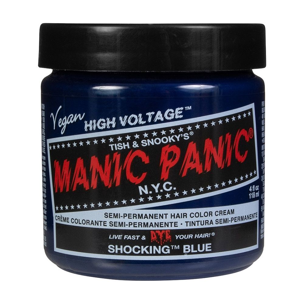 semi-permanente Haarfarbe High Voltage Classic von Manic Panic umfasst eine Vielzahl an leuchtenden Farbtönen. Die verwendeten hochwertigen Inhaltsstoffe stellen sicher, dass du ein hochwertiges Farbergebnis erhältst. Die pflegenden Inhaltsstoffe in der Formel konditionieren das Haar während des Färbens und sorgen so für ein seidig-glänzendes Finish sowie ein geschmeidiges Haargefühl.Manic Panic Haarfarben sind gebrauchsfertig und es ist kein Entwickler erforderlich. Die besten Ergebnisse erzielst du, wenn du dein Haar vorab mit dem Manic Panic Flash Lightning Bleach Kit auf ein helles Blond aufhellst.- Vegan und tierversuchsfrei- Frei von: PPD, Parabenen, Ammoniak, Resorcin, Phthalaten und Gluten- Etwa 4 - 6 Wochen lang anhaltende Farbe- Verblasst allmählich mit jeder Haarwäsche- Farbtöne sind untereinander mischbar- Kombinierbar mit dem Pastel-izer, um sanfte, trendige Pastelltöne zu kreieren- 8 UV-reaktive Farbtöne erhältlich, die unter Schwarzlicht leuchten- Gebrauchsfertig, kein Entwickler nötig- Beste Ergebnisse bei voraufgehelltem Haar- Hergestellt in den USA[Shocking Blue Haartönung]Shocking Blue ist eine dunkle kobaltblaue Haartönung. Um beste Ergebnisse zu erzielen, empfehlen wir, das Haar auf einen sehr hellen, kühlen Blondton der Stufe 9 oder heller aufzuhellen. Alle semipermanenten blauen Haarfarben können mit Gelbtönen in blondiertem Haar interagieren und einen Grünstich erzeugen. Deshalb sollte man vor dem Auftragen einen Strähnentest machen, um sicherzustellen, dass man das gewünschte Ergebnis erzielt! Wenn du einen möglichen grünen Unterton vermeiden möchtest, kannst du einen violetten Farbton wie Purple Haze hinzufügen, um diesen Effekt zu kompensieren. Mit Pastel-izer gemischt, wird Shocking Blue zu einem wunderschönen stahlgrauen Pastellton!Wichtige MerkmaleErforderliches Haarlevel : 9 oder höherIntensität: ModeratLanglebigkeit der Farbe : ModeratUV-reaktiv : Nein[Wie viele 118 ml Dosen brauche ich für mein Haar?]- Kurzes bis boblanges Haar: 1 - 2 Dosen, je nach Haardicke- Schulter- bis taillenlanges Haar: 2 - 3 Dosen, je nach Haardicke. Bei dickem Haar kann eine zusätzliche Dose für die Spitzen erforderlich sein.- Taillenlanges und längeres Haar: 3+ Dosen, je nach Dicke des Haares[Anwendung]1. Das Haar mit einem tiefenreinigenden Shampoo waschen, keine Spülung verwenden.2. Trockne das Haar mit einem Föhn, um sicherzustellen, dass das Haar extrem porös ist.3. Ziehe Handschuhe an und trage die Tönung Strähne für Strähne mit einem Färbepinsel auf. Stelle sicher, dass jede Haarsträhne mit ausreichend Farbe bedeckt ist, um ein fleckiges Ergebnis zu vermeiden.4. Kämme anschließend das Haar durch, um sicherzustellen, dass die Farbe gleichmäßig verteilt wird. Die Farbcreme kann leicht schaumig werden.5. Decke das Haar mit einer Plastikhaube ab und lass die Farbe 30-45 Minuten einwirken. Für mehr Intensität unter einer Wärmequelle einwirken lassen.6. Spüle das Haar mit kaltem Wasser aus, bis das Wasser klar ist. Kontakt mit Gesicht und Körper vermeiden. Haare nicht shampoonieren.7. Wie gewünscht stylen. Um Farbübertragungen zu vermeiden, bitte immer sicherstellen, dass das Haar vollständig getrocket ist.[Profi-Tipps:]- Zur Sicherheit immer einen Strähnentest vorab durchführen.- Vor dem Färben ein pH-neutrales Shampoo verwenden, damit die Haarfarbe besser in das Haar einziehen kann.- Nach dem Auftragen der Farbe 5-10 Minuten lang gleichmäßig Wärme mit einem Haartrockner auf das Haar geben. Dadurch wird die Schuppenschicht geöffnet und die Manic Panic Haarfarbe kann besser ins Haar eindringen. Achte darauf, dass das Haar vor dem Ausspülen der Farbe vollständig abgekühlt ist.- Damit die Farbe länger frisch aussieht: mit kaltem Wasser Haare waschen, Manic Panic Hair Freshener/Trockenshampoo verwenden, Haare bei niedriger Hitze stylen. Bei Bedarf, füge bei deinem Conditioner etwas von der Haarfarbe hinzu!- Wir empfehlen, das Haar vor dem Färben zu blondieren.[Achtung]Nur zur äußeren Anwendung. Außerhalb der Reichweite von Kindern aufbewahren. Nur nach Anweisung verwenden. Dieses Produkt enthält Inhaltsstoffe, die bei bestimmten Personen zu Hautreizungen führen können; daher sollte zunächst ein Vorversuch gemäß den beiliegenden Anweisungen durchgeführt werden. Dieses Produkt nicht zum Färben von Augenbrauen oder Wimpern verwenden; dies kann zur Erblindung führen. Wenn das Produkt in die Augen gelangt, die Augen sofort mit Wasser ausspülen und einen Arzt aufsuchen.