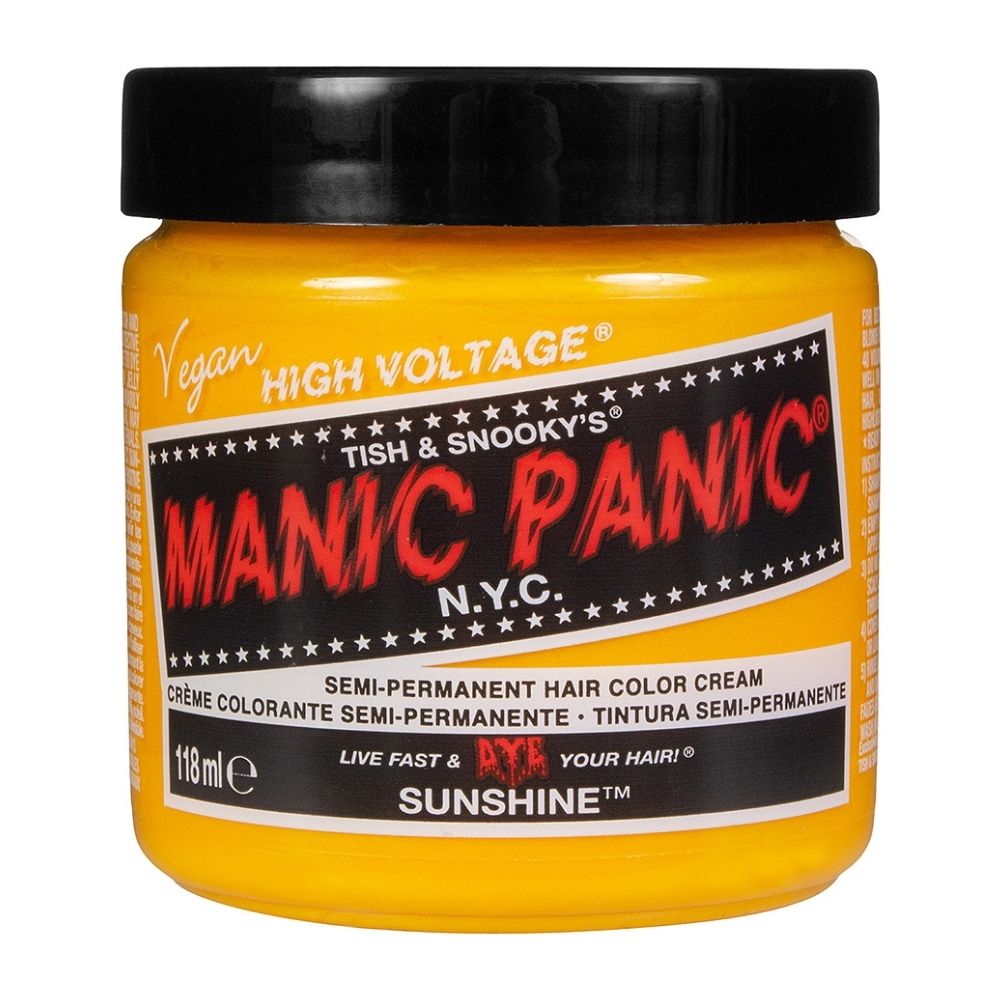 semi-permanente Haarfarbe High Voltage Classic von Manic Panic umfasst eine Vielzahl an leuchtenden Farbtönen. Die verwendeten hochwertigen Inhaltsstoffe stellen sicher, dass du ein hochwertiges Farbergebnis erhältst. Die pflegenden Inhaltsstoffe in der Formel konditionieren das Haar während des Färbens und sorgen so für ein seidig-glänzendes Finish sowie ein geschmeidiges Haargefühl.Manic Panic Haarfarben sind gebrauchsfertig und es ist kein Entwickler erforderlich. Die besten Ergebnisse erzielst du, wenn du dein Haar vorab mit dem Manic Panic Flash Lightning Bleach Kit auf ein helles Blond aufhellst.- Vegan und tierversuchsfrei- Frei von: PPD, Parabenen, Ammoniak, Resorcin, Phthalaten und Gluten- Etwa 4 - 6 Wochen lang anhaltende Farbe- Verblasst allmählich mit jeder Haarwäsche- Farbtöne sind untereinander mischbar- Kombinierbar mit dem Pastel-izer, um sanfte, trendige Pastelltöne zu kreieren- 8 UV-reaktive Farbtöne erhältlich, die unter Schwarzlicht leuchten- Gebrauchsfertig, kein Entwickler nötig- Beste Ergebnisse bei voraufgehelltem Haar- Hergestellt in den USA[Sunshine Haartönung]Sunshine ist eine warme, leicht orange und sonnenblumengelbe Haartönung. Für ein optimales Ergebnis empfehlen wir, das Haar vor der Anwendung auf die Blondstufe 9 oder heller aufzuhellen.Wichtige MerkmaleErforderliches Haarlevel : 9 oder höherIntensität: ModeratLanglebigkeit der Farbe : ModeratUV-reaktiv : Nein[Wie viele 118 ml Dosen brauche ich für mein Haar?]- Kurzes bis boblanges Haar: 1 - 2 Dosen, je nach Haardicke- Schulter- bis taillenlanges Haar: 2 - 3 Dosen, je nach Haardicke. Bei dickem Haar kann eine zusätzliche Dose für die Spitzen erforderlich sein.- Taillenlanges und längeres Haar: 3+ Dosen, je nach Dicke des Haares[Anwendung]1. Das Haar mit einem tiefenreinigenden Shampoo waschen, keine Spülung verwenden.2. Trockne das Haar mit einem Föhn, um sicherzustellen, dass das Haar extrem porös ist.3. Ziehe Handschuhe an und trage die Tönung Strähne für Strähne mit einem Färbepinsel auf. Stelle sicher, dass jede Haarsträhne mit ausreichend Farbe bedeckt ist, um ein fleckiges Ergebnis zu vermeiden.4. Kämme anschließend das Haar durch, um sicherzustellen, dass die Farbe gleichmäßig verteilt wird. Die Farbcreme kann leicht schaumig werden.5. Decke das Haar mit einer Plastikhaube ab und lass die Farbe 30-45 Minuten einwirken. Für mehr Intensität unter einer Wärmequelle einwirken lassen.6. Spüle das Haar mit kaltem Wasser aus, bis das Wasser klar ist. Kontakt mit Gesicht und Körper vermeiden. Haare nicht shampoonieren.7. Wie gewünscht stylen. Um Farbübertragungen zu vermeiden, bitte immer sicherstellen, dass das Haar vollständig getrocket ist.[Profi-Tipps:]- Zur Sicherheit immer einen Strähnentest vorab durchführen.- Vor dem Färben ein pH-neutrales Shampoo verwenden, damit die Haarfarbe besser in das Haar einziehen kann.- Nach dem Auftragen der Farbe 5-10 Minuten lang gleichmäßig Wärme mit einem Haartrockner auf das Haar geben. Dadurch wird die Schuppenschicht geöffnet und die Manic Panic Haarfarbe kann besser ins Haar eindringen. Achte darauf, dass das Haar vor dem Ausspülen der Farbe vollständig abgekühlt ist.- Damit die Farbe länger frisch aussieht: mit kaltem Wasser Haare waschen, Manic Panic Hair Freshener/Trockenshampoo verwenden, Haare bei niedriger Hitze stylen. Bei Bedarf, füge bei deinem Conditioner etwas von der Haarfarbe hinzu!- Wir empfehlen, das Haar vor dem Färben zu blondieren.[Achtung]Nur zur äußeren Anwendung. Außerhalb der Reichweite von Kindern aufbewahren. Nur nach Anweisung verwenden. Dieses Produkt enthält Inhaltsstoffe, die bei bestimmten Personen zu Hautreizungen führen können; daher sollte zunächst ein Vorversuch gemäß den beiliegenden Anweisungen durchgeführt werden. Dieses Produkt nicht zum Färben von Augenbrauen oder Wimpern verwenden; dies kann zur Erblindung führen. Wenn das Produkt in die Augen gelangt, die Augen sofort mit Wasser ausspülen und einen Arzt aufsuchen.