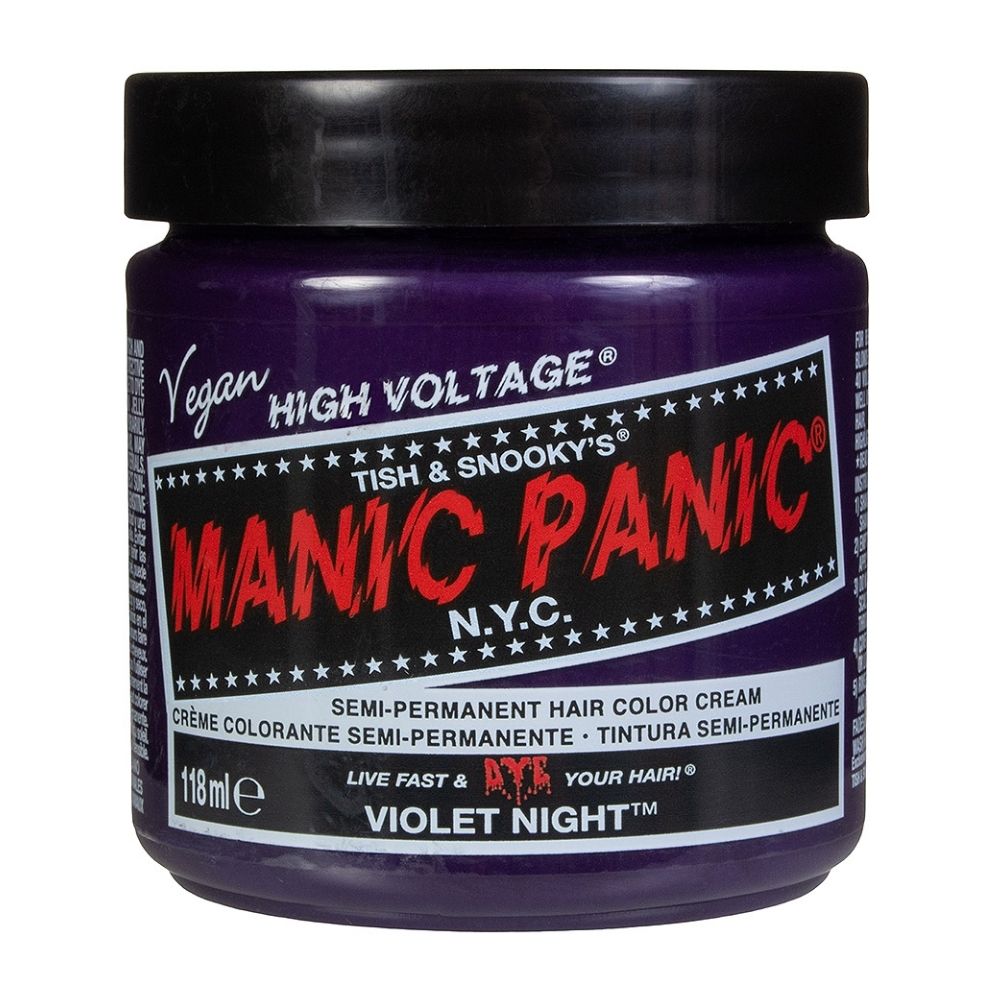 semi-permanente Haarfarbe High Voltage Classic von Manic Panic umfasst eine Vielzahl an leuchtenden Farbtönen. Die verwendeten hochwertigen Inhaltsstoffe stellen sicher, dass du ein hochwertiges Farbergebnis erhältst. Die pflegenden Inhaltsstoffe in der Formel konditionieren das Haar während des Färbens und sorgen so für ein seidig-glänzendes Finish sowie ein geschmeidiges Haargefühl.Manic Panic Haarfarben sind gebrauchsfertig und es ist kein Entwickler erforderlich. Die besten Ergebnisse erzielst du, wenn du dein Haar vorab mit dem Manic Panic Flash Lightning Bleach Kit auf ein helles Blond aufhellst.- Vegan und tierversuchsfrei- Frei von: PPD, Parabenen, Ammoniak, Resorcin, Phthalaten und Gluten- Etwa 4 - 6 Wochen lang anhaltende Farbe- Verblasst allmählich mit jeder Haarwäsche- Farbtöne sind untereinander mischbar- Kombinierbar mit dem Pastel-izer, um sanfte, trendige Pastelltöne zu kreieren- 8 UV-reaktive Farbtöne erhältlich, die unter Schwarzlicht leuchten- Gebrauchsfertig, kein Entwickler nötig- Beste Ergebnisse bei voraufgehelltem Haar- Hergestellt in den USA[Violet Night Haartönung]Violet Night ist unsere dunkelste kühlviolette Haartönung. Dieser Farbton kann sogar ungefärbtem, unblondiertem Haar tiefe violette Töne verleihen. Für beste Ergebnisse empfehlen wir jedoch, das Haar vor der Anwendung auf ein Blond der Stufe 7 oder heller aufzuhellen.Wichtige MerkmaleErforderliches Haarlevel : 7 oder höherIntensität: KräftigLanglebigkeit der Farbe : HochUV-reaktiv : Nein[Wie viele 118 ml Dosen brauche ich für mein Haar?]- Kurzes bis boblanges Haar: 1 - 2 Dosen, je nach Haardicke- Schulter- bis taillenlanges Haar: 2 - 3 Dosen, je nach Haardicke. Bei dickem Haar kann eine zusätzliche Dose für die Spitzen erforderlich sein.- Taillenlanges und längeres Haar: 3+ Dosen, je nach Dicke des Haares[Anwendung]1. Das Haar mit einem tiefenreinigenden Shampoo waschen, keine Spülung verwenden.2. Trockne das Haar mit einem Föhn, um sicherzustellen, dass das Haar extrem porös ist.3. Ziehe Handschuhe an und trage die Tönung Strähne für Strähne mit einem Färbepinsel auf. Stelle sicher, dass jede Haarsträhne mit ausreichend Farbe bedeckt ist, um ein fleckiges Ergebnis zu vermeiden.4. Kämme anschließend das Haar durch, um sicherzustellen, dass die Farbe gleichmäßig verteilt wird. Die Farbcreme kann leicht schaumig werden.5. Decke das Haar mit einer Plastikhaube ab und lass die Farbe 30-45 Minuten einwirken. Für mehr Intensität unter einer Wärmequelle einwirken lassen.6. Spüle das Haar mit kaltem Wasser aus, bis das Wasser klar ist. Kontakt mit Gesicht und Körper vermeiden. Haare nicht shampoonieren.7. Wie gewünscht stylen. Um Farbübertragungen zu vermeiden, bitte immer sicherstellen, dass das Haar vollständig getrocket ist.[Profi-Tipps:]- Zur Sicherheit immer einen Strähnentest vorab durchführen.- Vor dem Färben ein pH-neutrales Shampoo verwenden, damit die Haarfarbe besser in das Haar einziehen kann.- Nach dem Auftragen der Farbe 5-10 Minuten lang gleichmäßig Wärme mit einem Haartrockner auf das Haar geben. Dadurch wird die Schuppenschicht geöffnet und die Manic Panic Haarfarbe kann besser ins Haar eindringen. Achte darauf, dass das Haar vor dem Ausspülen der Farbe vollständig abgekühlt ist.- Damit die Farbe länger frisch aussieht: mit kaltem Wasser Haare waschen, Manic Panic Hair Freshener/Trockenshampoo verwenden, Haare bei niedriger Hitze stylen. Bei Bedarf, füge bei deinem Conditioner etwas von der Haarfarbe hinzu!- Wir empfehlen, das Haar vor dem Färben zu blondieren.[Achtung]Nur zur äußeren Anwendung. Außerhalb der Reichweite von Kindern aufbewahren. Nur nach Anweisung verwenden. Dieses Produkt enthält Inhaltsstoffe, die bei bestimmten Personen zu Hautreizungen führen können; daher sollte zunächst ein Vorversuch gemäß den beiliegenden Anweisungen durchgeführt werden. Dieses Produkt nicht zum Färben von Augenbrauen oder Wimpern verwenden; dies kann zur Erblindung führen. Wenn das Produkt in die Augen gelangt, die Augen sofort mit Wasser ausspülen und einen Arzt aufsuchen.